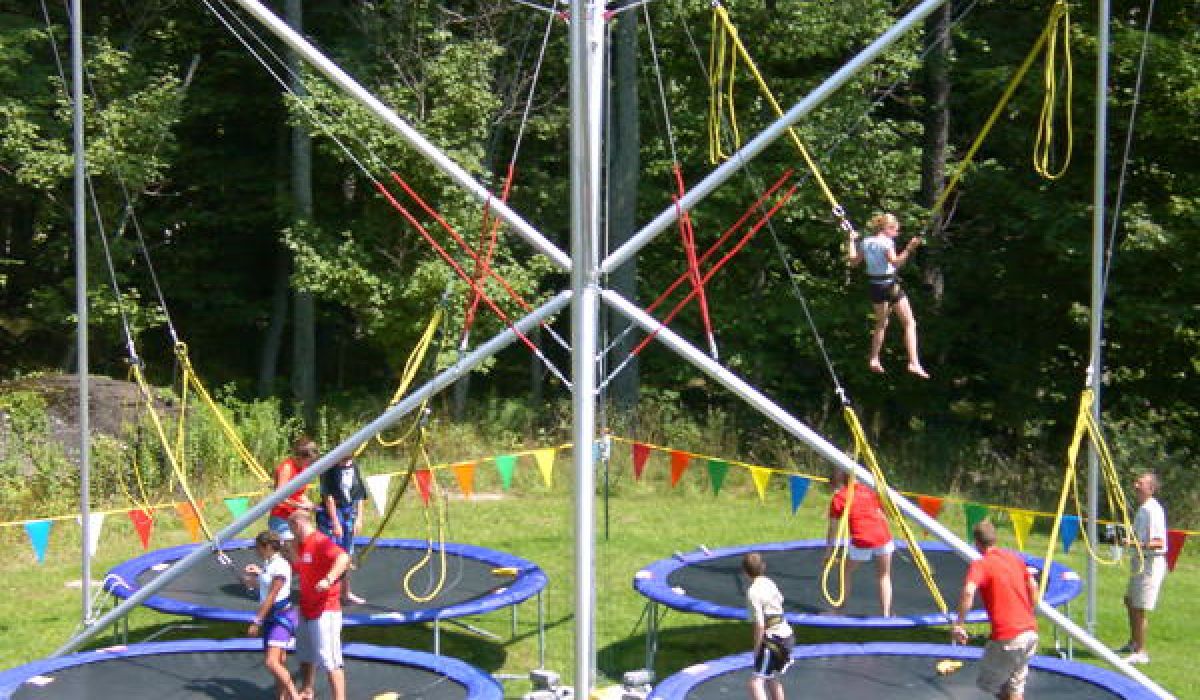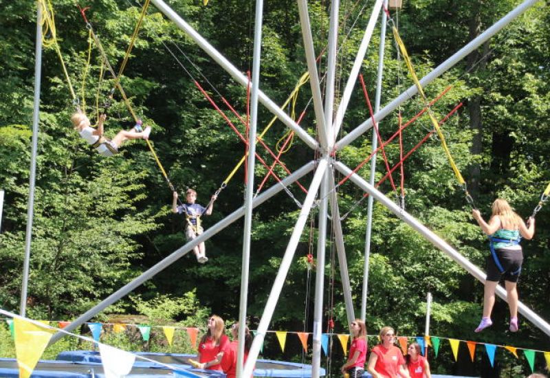 Jump into the action and bounce your way to fun at one of Cayuga’s wildest activities - EXTREME SPORT JUMPING. It takes place on our bungee trampoline, which is a large rig that combines a trampoline system with a bungee cord system. The rig features 4 separate trampolines, so 4 campers can participate at one time. It also features a patented bungee cord system that includes a hydraulic lift that automatically readjusts the height settings on the rig as you jump higher and higher. With this safety feature, you can’t over-stretch the bungee cord while jumping. There’s no other system like it. The bungee cord can propel you up to 24 feet in the air!