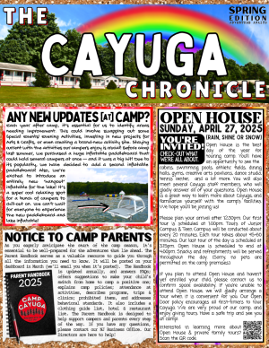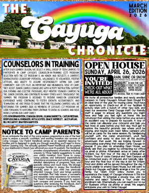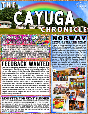 Cayuga Newsletters keep you apprised of what’s happening in ‘Cayugaland’. Campers receive a notification via email each time we post a newsletter. To read our most recent newsletters, simply click the download button. Be sure to check-out Cayuga’s Facebook page and Instagram for quick updates and more photographs.